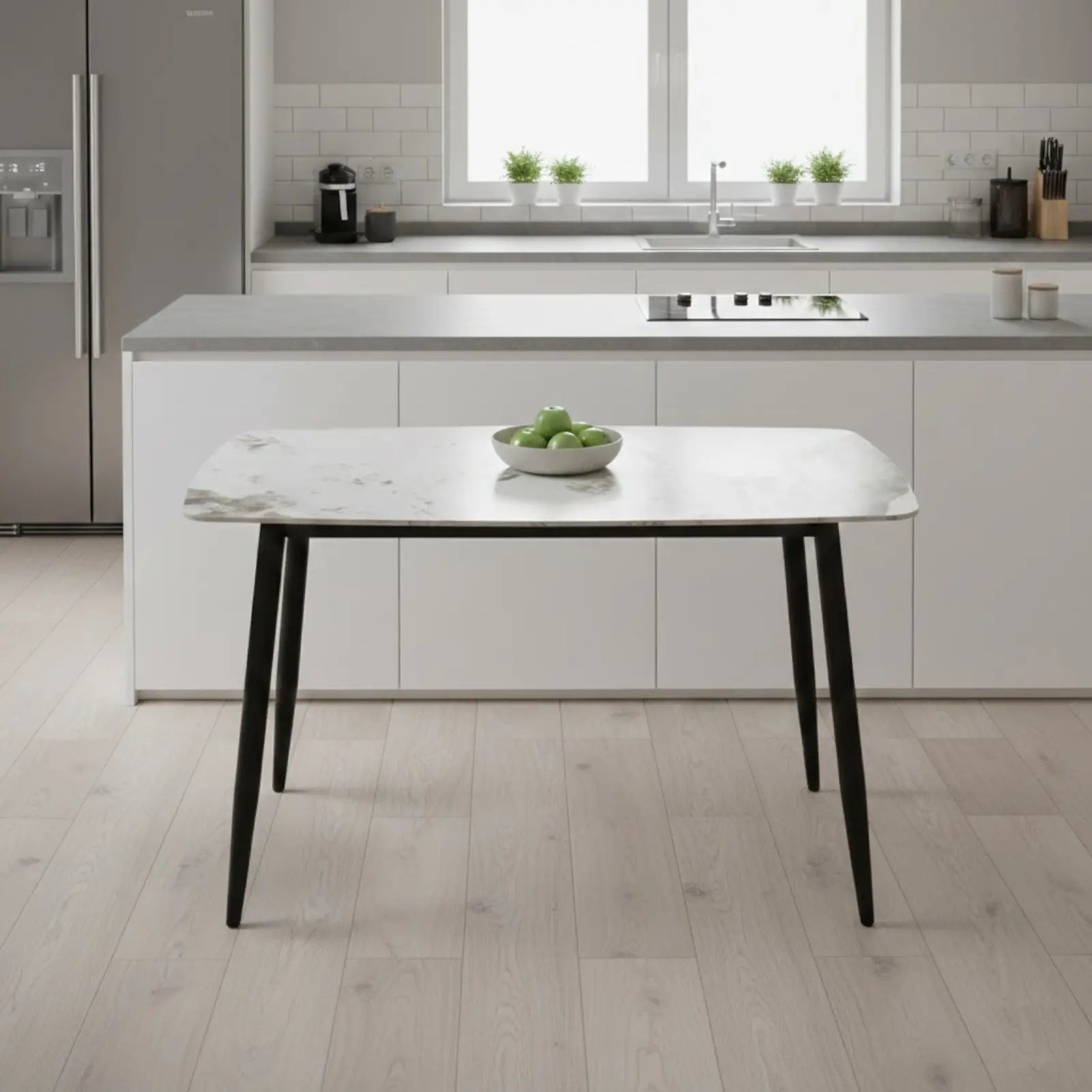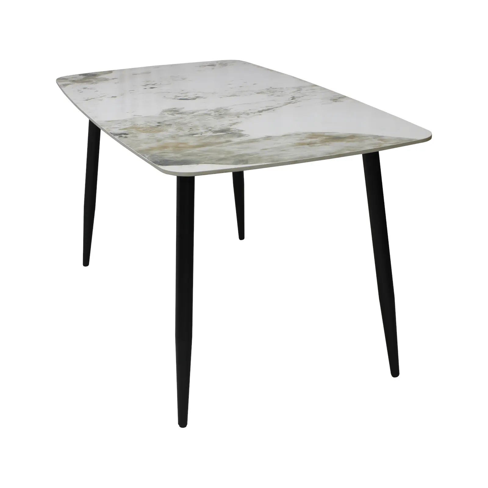 Плотът на масата е изработен от синтерован камък, който осигурява висока устойчивост и дълготрайност. Лъскавата повърхност е устойчива на надрасквания и петна и е подходяща за ежедневна употреба.