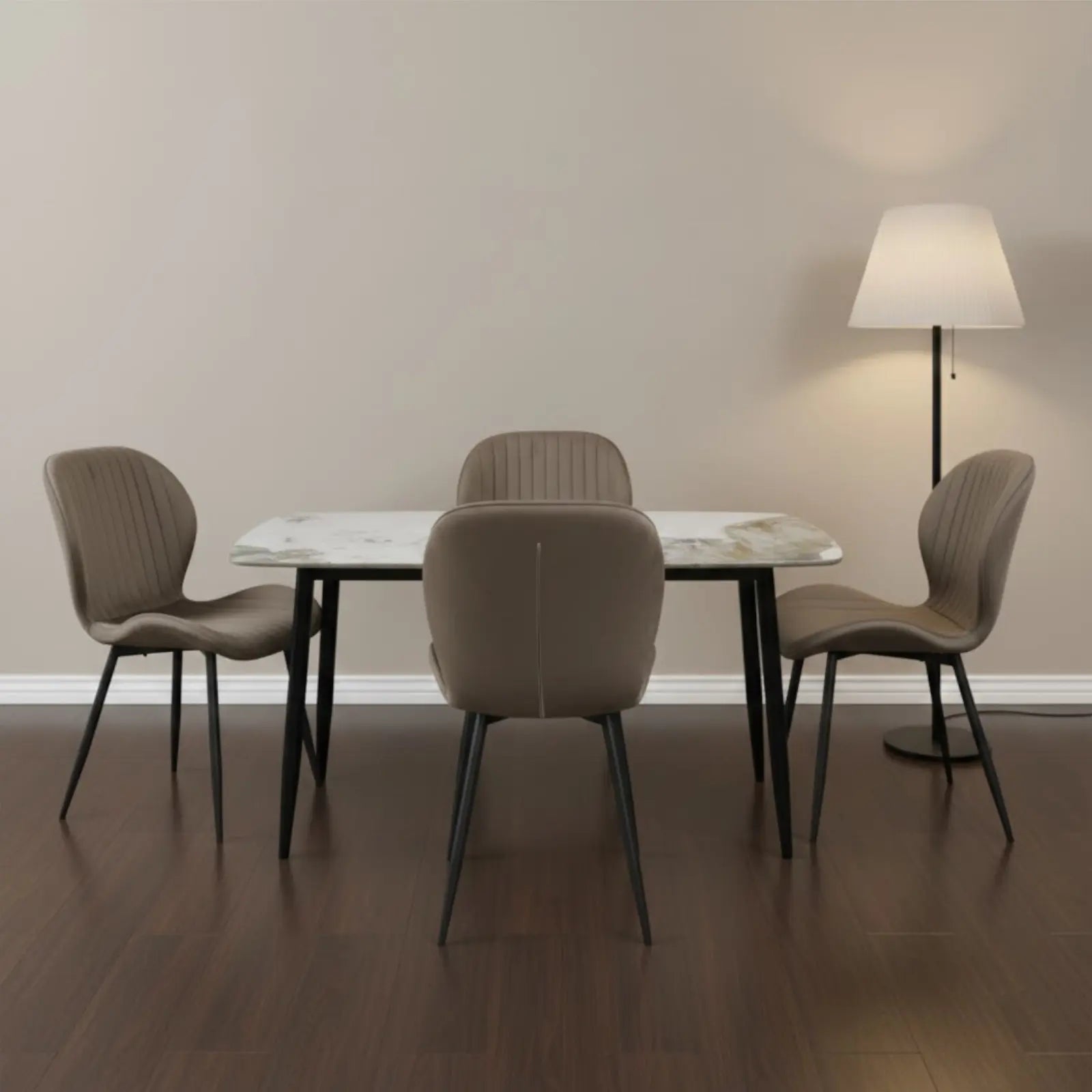 Комплект трапезна маса Atlas кафяв мрамор с 4 стола Estera включва една фиксирана маса и 4 тапицирани стола, изработени от текстил с модерен и атрактивен дизайн, подходящи за кухня или дневна.