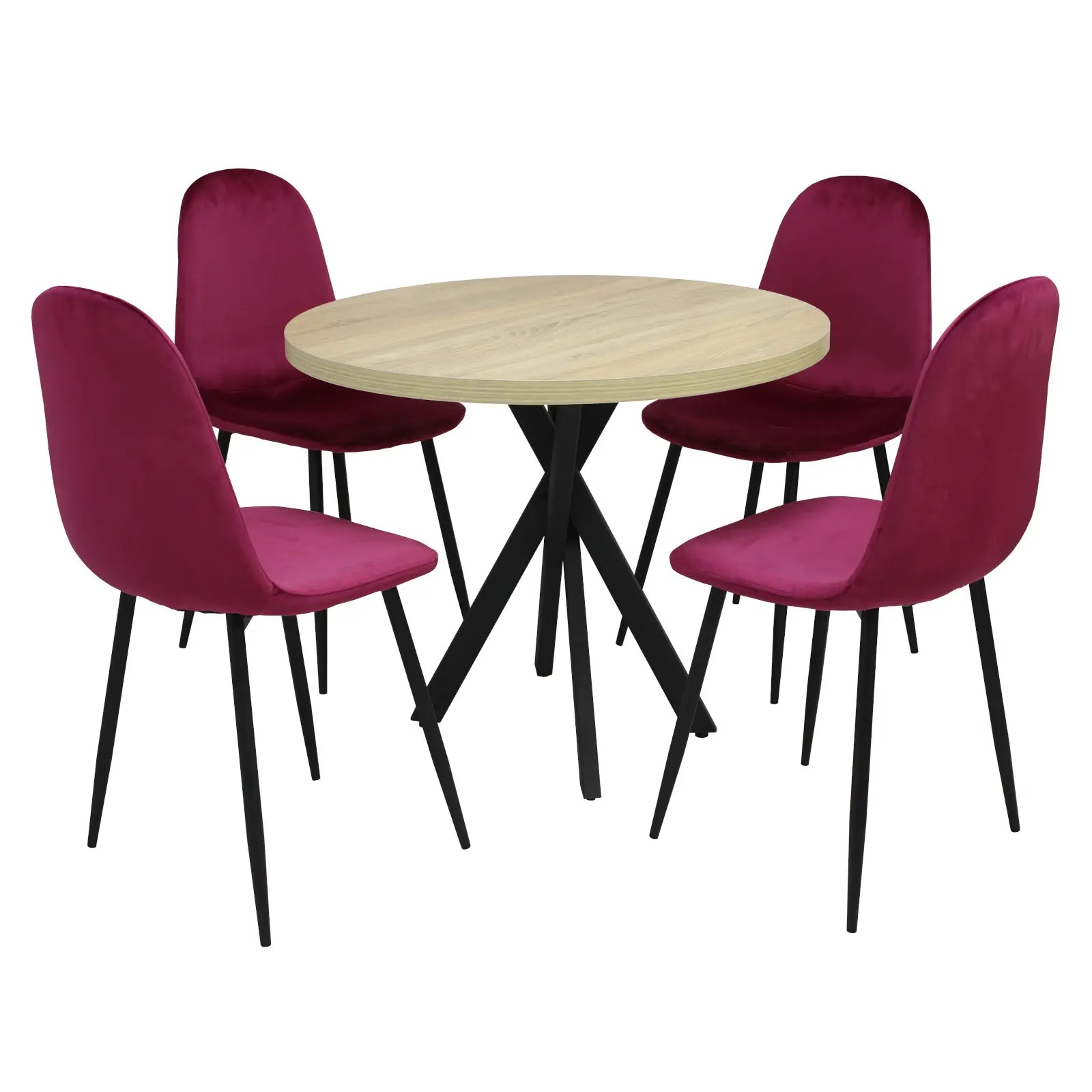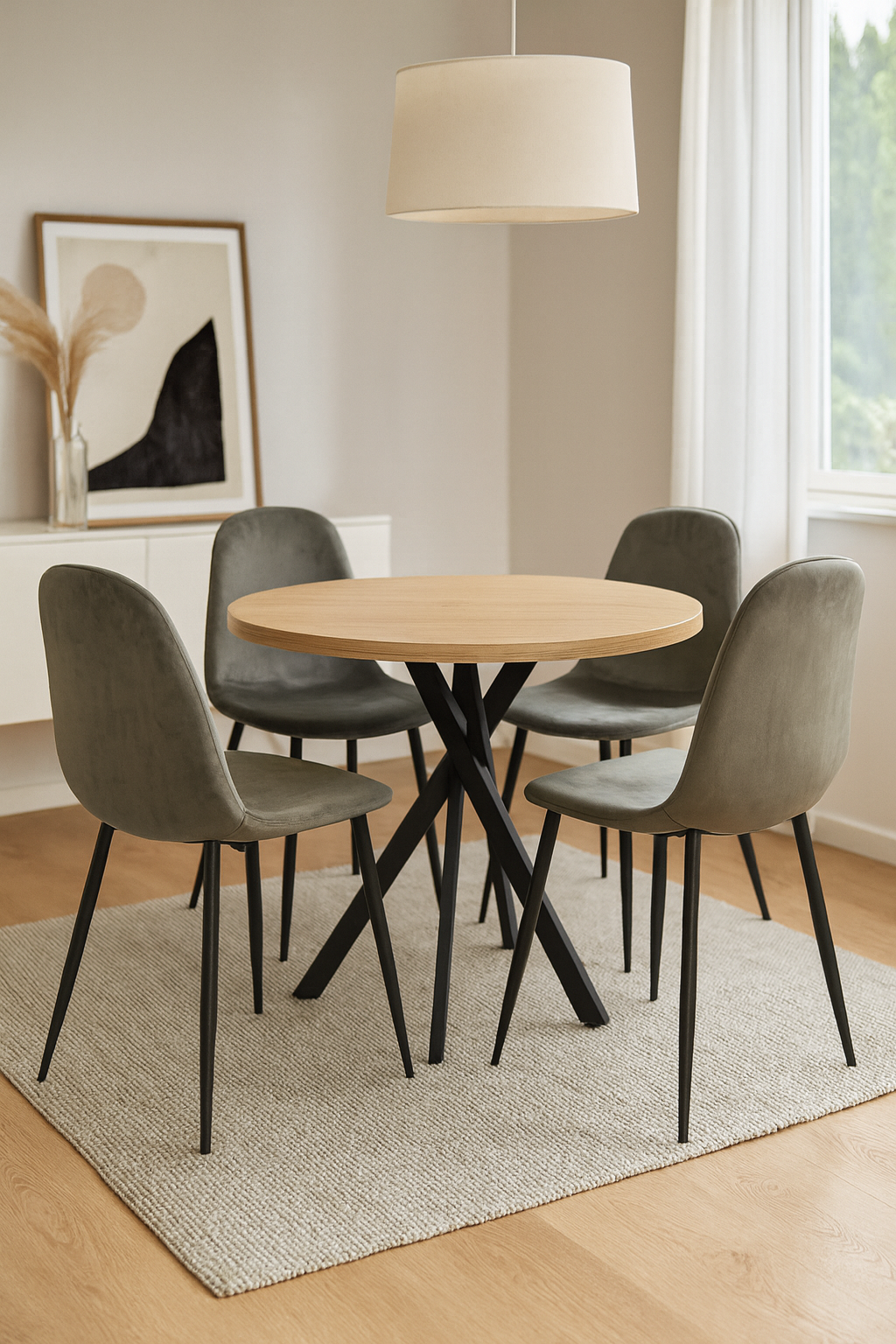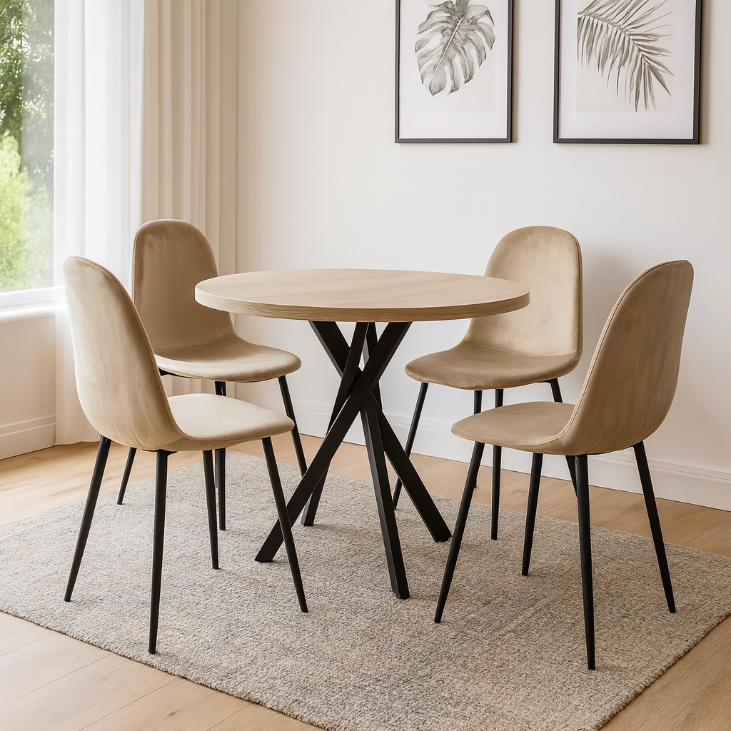 Маса фиксирана кръгла Vega X с 4 стола Luna може да се включи във вашия дом, дори близо до разтегателна маса, като скандинавски модел, който се вписва в декора на всяко помещение.