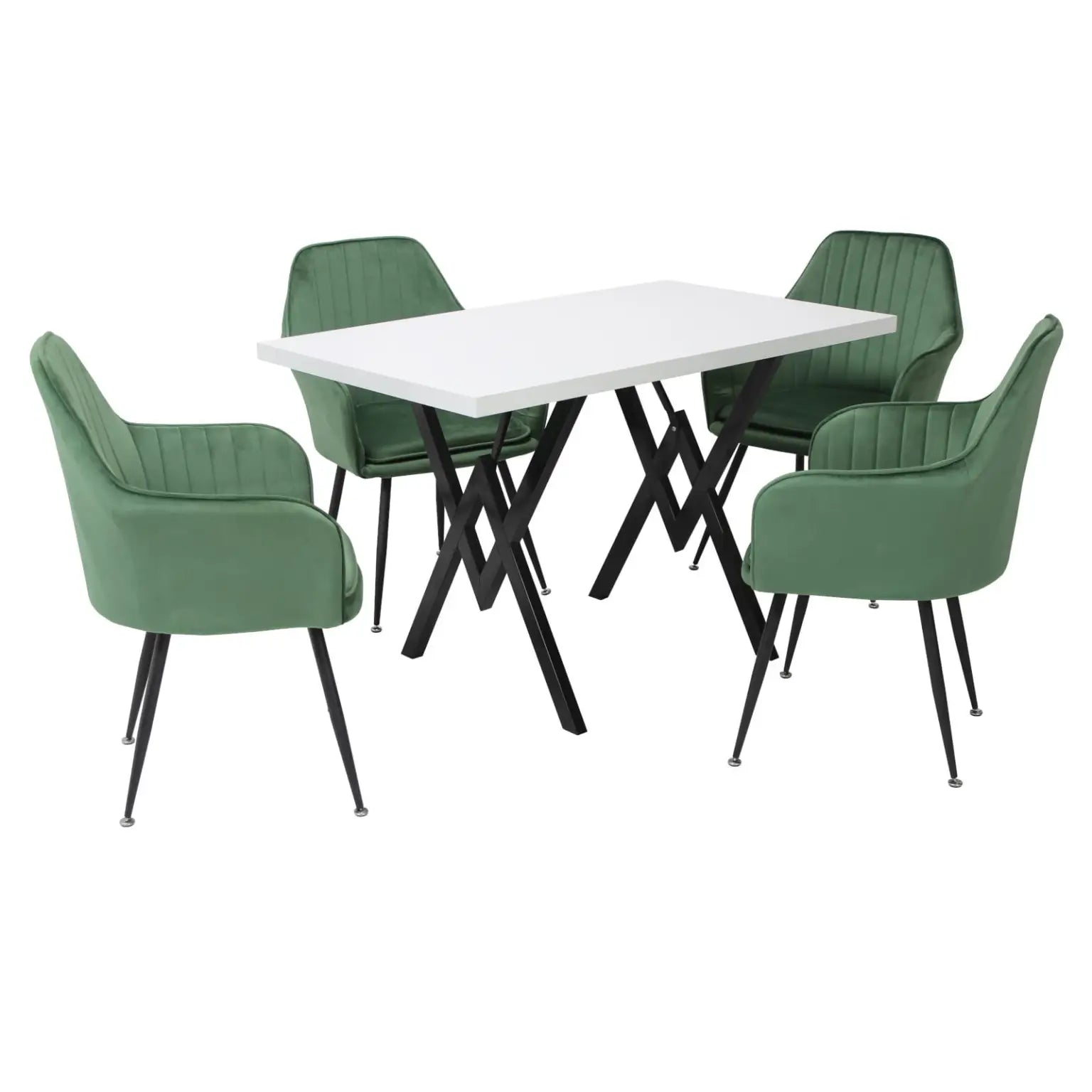 Hetti Stela комплект от фиксирана маса за хранене и 4 стола Корал съдържа фиксирана маса за хранене и 4 тапицирани стола с модерен и атрактивен дизайн, които са идеални за основните помещения в дома ви: кухня или всекидневна.