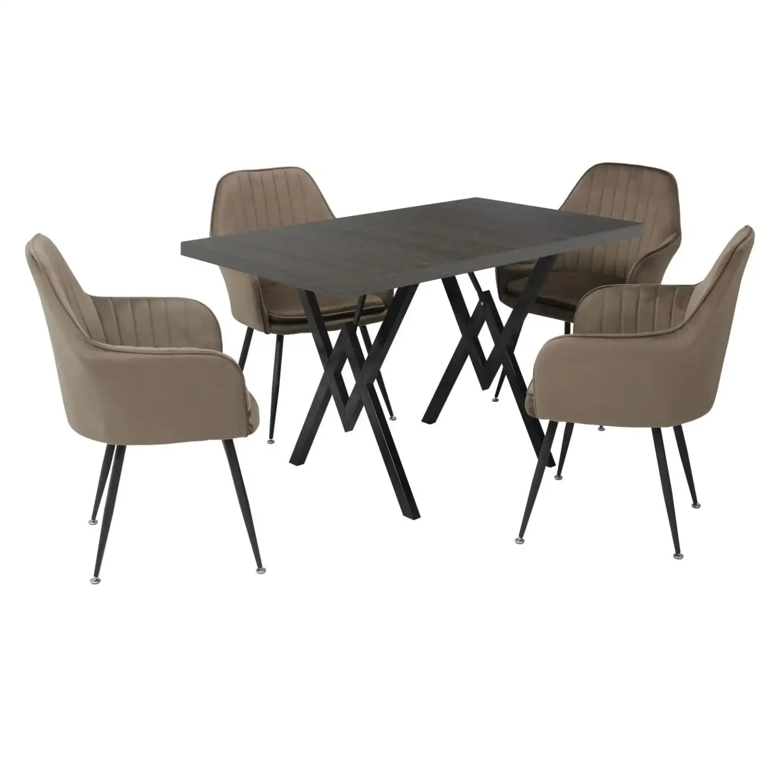Hetti Stela комплект от фиксирана маса за хранене и 4 стола Корал съдържа фиксирана маса за хранене и 4 тапицирани стола с модерен и атрактивен дизайн, които са идеални за основните помещения в дома ви: кухня или всекидневна.