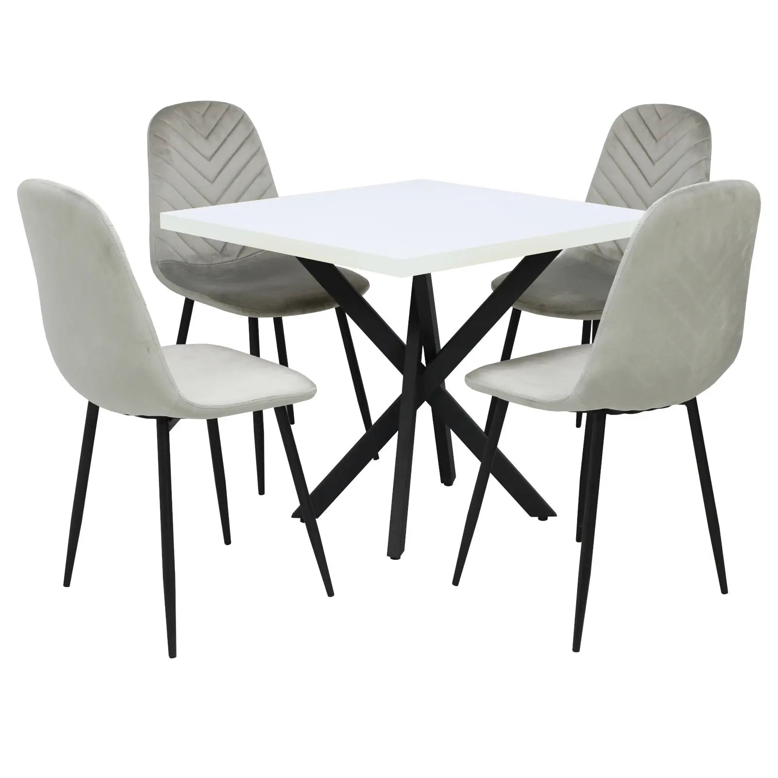 Комплектът съдържа една квадратна маса и 4 тапицирани стола, изработени с модерен и изчистен дизайн, подходящи за основните помещения във вашия дом – кухня или всекидневна.