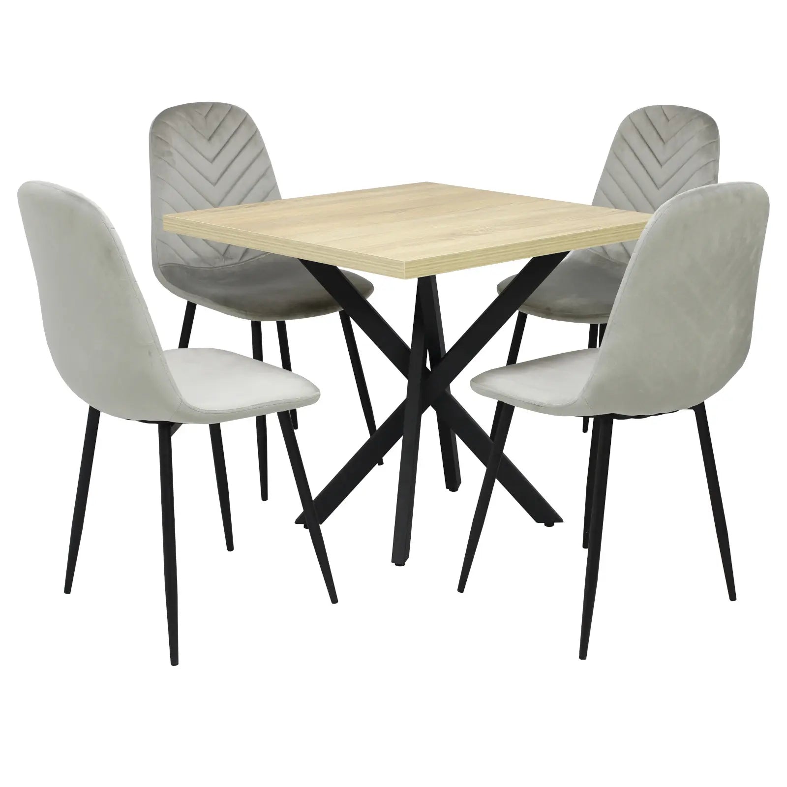 Комплектът съдържа една квадратна маса и 4 тапицирани стола, изработени с модерен и изчистен дизайн, подходящи за основните помещения във вашия дом – кухня или всекидневна.