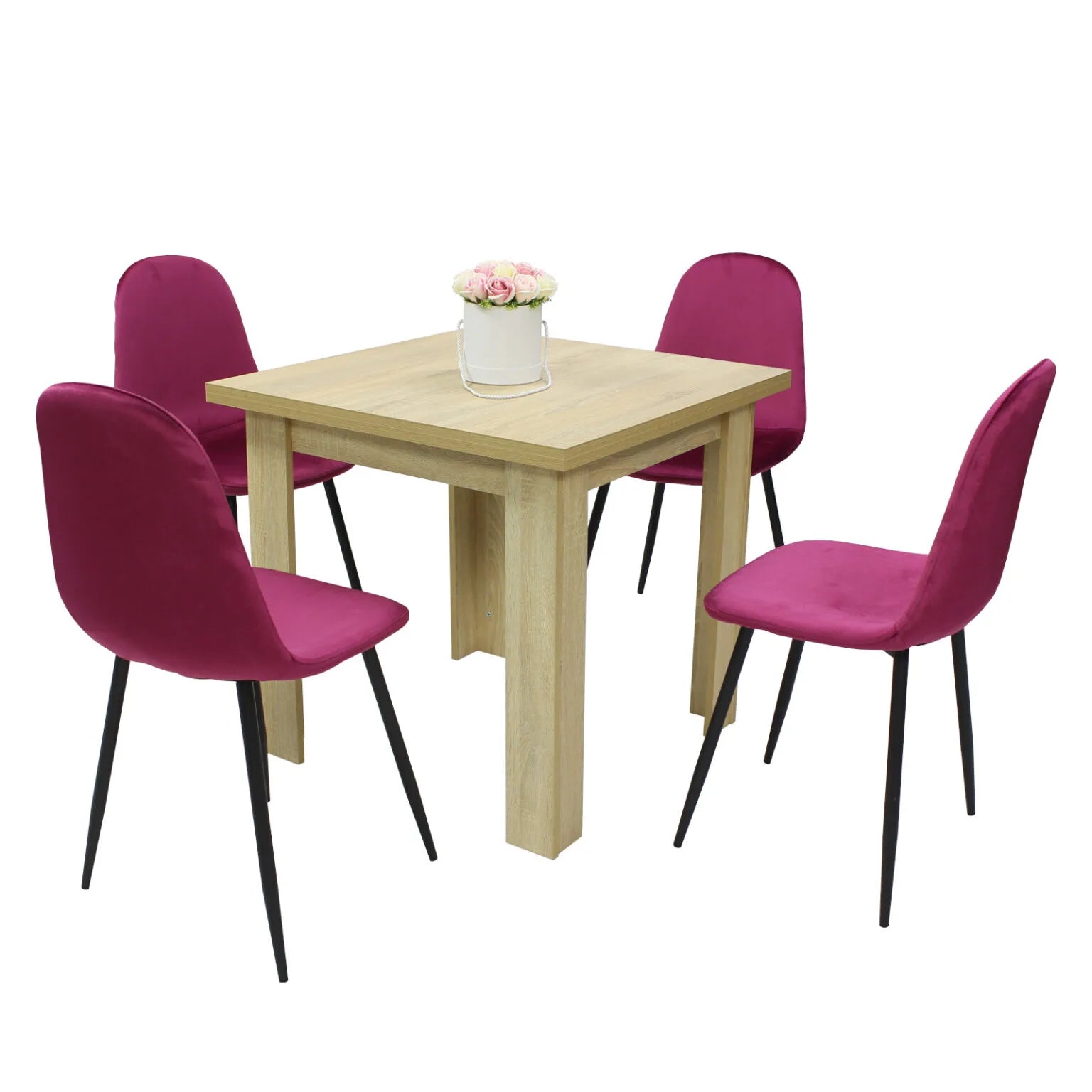 Масата с Фиксирана Квадратна Форма Vero Дъб с 4 Стола Paradise съдържа фиксирана маса и 4 тапицирани стола, изработени с модерен и привлекателен дизайн, идеални за основните помещения в дома ви: кухня или хол.