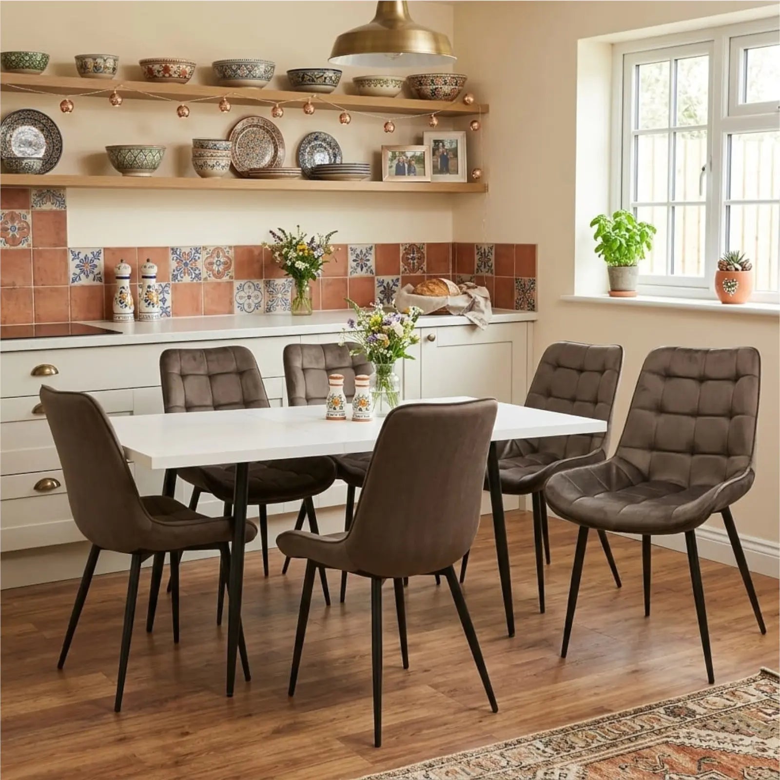 Комплектът от маса и 6 стола може лесно да бъде включен във вашия интериор, дори в близост до разтегателен диван.